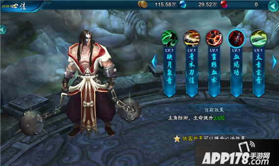 主角防御、生命提升2.5%(心法效果随侠客星级提升)