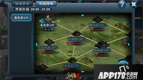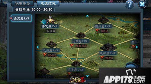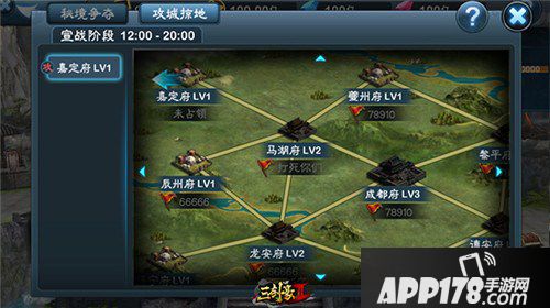 大地图中的每个区域都只能由外围开始攻打,即只能先攻打1级城池。当攻下1级城池之后,才有权力在下次跨服战中攻打2级城池,以此类推。需要注意的是,在下次战斗时,其他帮派也有权力攻打您所具有的2级城池,是进而攻,或退而守。需要帮助认真揣摩。