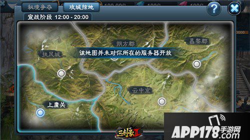 需要注意的是,虽然大地图暂时分为5大块。但是您当前能攻打的版块,是由官方决定的。举个例子(只具说明作用,不代表实际)1-10服只能攻打上庸关,而不能攻打其他版块。