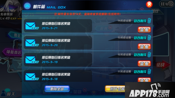 邮件中会保留系统给玩家发送的邮件,有些活动也会通过邮件发送,比如排位赛奖励,附件会添加在邮件中,需要玩家查看并领取。