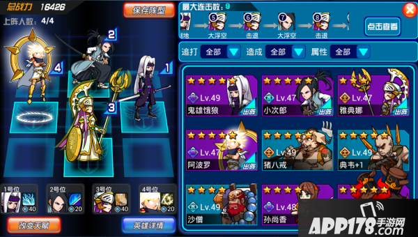 队伍界面中可以编辑上阵武将,并且可以查看连击效果,更换武将,改变天赋,查看英雄详情。