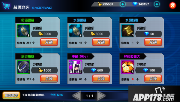 商店中每天定时会刷新一些游戏道具,进阶物品,武将碎片等,通过金币或钻石购买。玩家也可以使用手动刷新来更新商店中的道具。