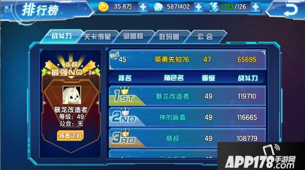 点击排行榜点进去之后,可以看到几个子栏目,分别是战斗力,关卡得星,驯兽榜,数码兽和公会这个五个栏目。其中,战斗力这一项,主要是根据全区玩家的战斗力多少进行排行,战斗力最高的当然就是排行榜的第一了。所以,玩家们应努力提升战斗力,使自己的排名尽量靠前。