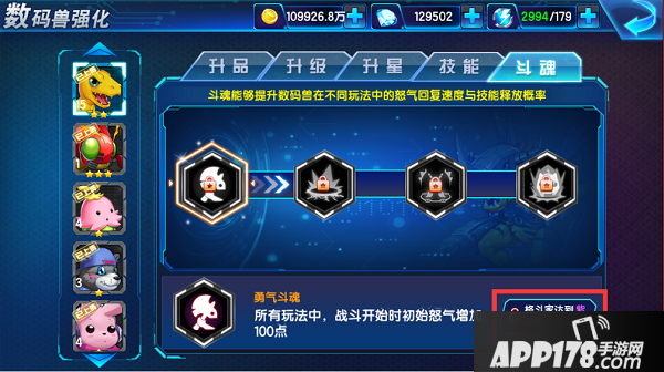 勇气斗魂:数码兽达到蓝品后可以解锁,能让数码兽在所有玩法中初始怒气增加100点。