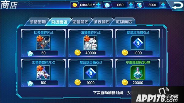 出售数码宝贝碎片。经验秘籍、经验药水等。只能使用试炼币购买,每隔几小时就会刷新一次商店内的道具。