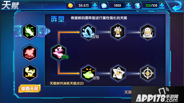 阵型天赋由魔武双修分为两支,一支是针对前排数码兽的增强,一支是针对后排数码兽的增强。