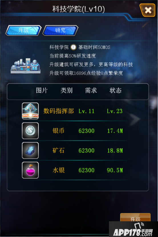 升级科技学院,可解锁更多的科技条目和提高科研时间效率。