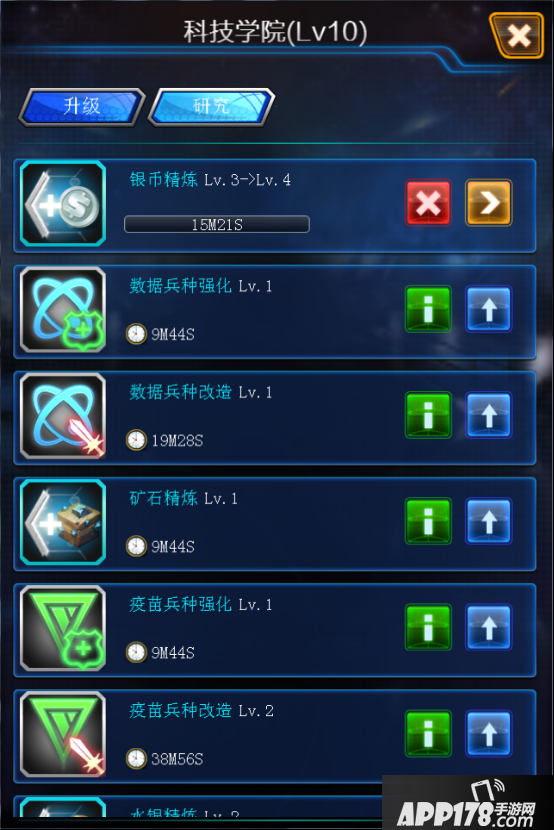 升级每条科技需要消耗一定的资源和道具。资源道具的储备越多,可允许升级的科技条目数量也就越多,带来更多的游戏属性加成。