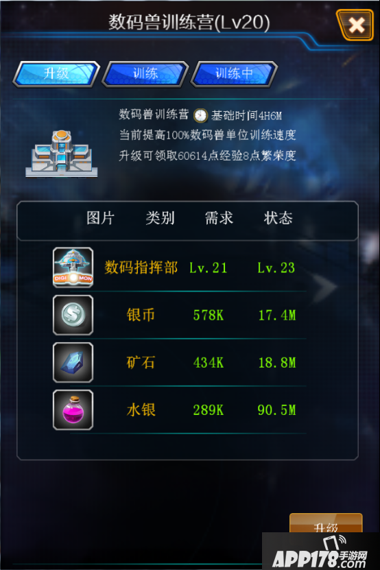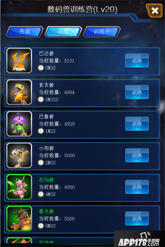 升级训练营,可解锁更多的数码兽生产和提高生产时间效率。
