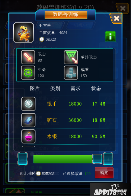 数码兽训练需要消耗一定的资源和道具。资源道具的储备越多,可允许训练的数量也就越多。