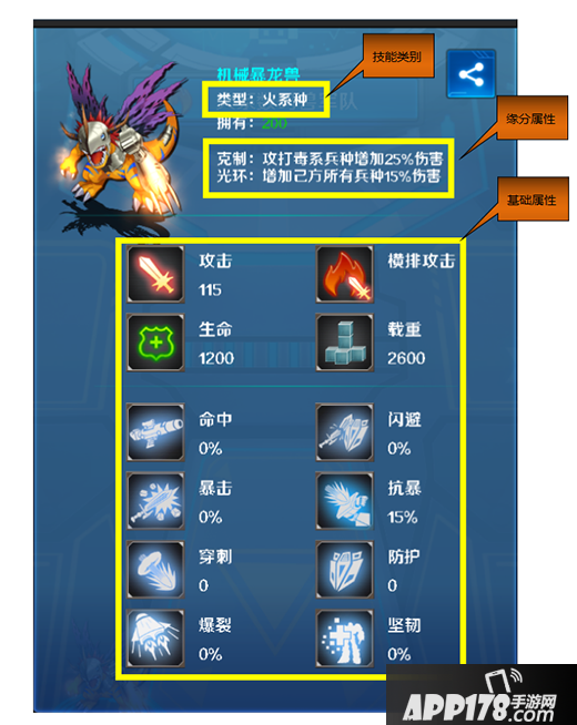 每个数码兽均具备最基础的12种攻防属性。包括:攻击、生命、攻击范围、载重、命中、闪避、暴击、抗暴、穿刺、防护、爆裂、坚韧。