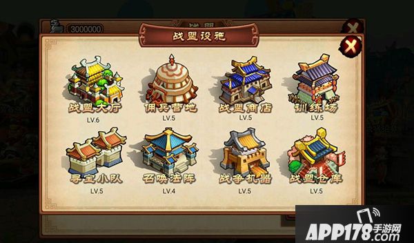 战盟设施包括:战盟大厅,佣兵营地,战盟商店,训练场,寻宝小队,召唤法阵,战争机械,战争仓库。