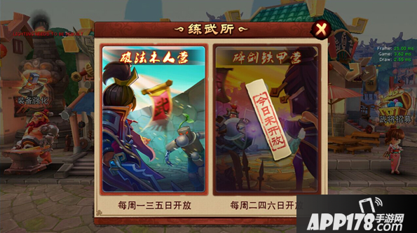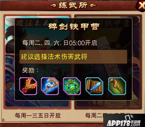 练武所分成物理免疫和法术免疫2类,分别在每周单日和双日开放。周日两个类型会同时开放。玩家需要根据不同类型合理安排武将,以尽快获取装备给武将进阶。