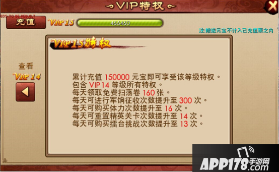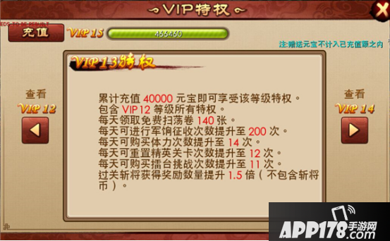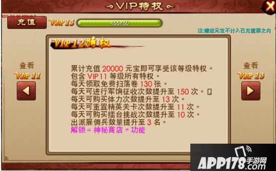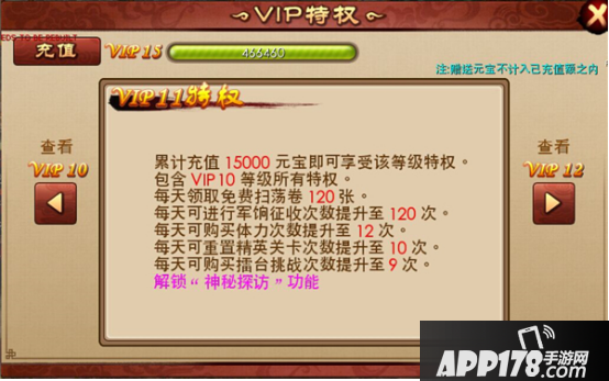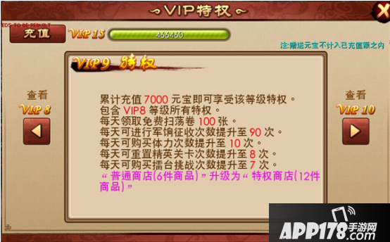 根据玩家的充值额度的不同,玩家获得的VIP等级也不同,不同VIP获得的特权也不相同。
