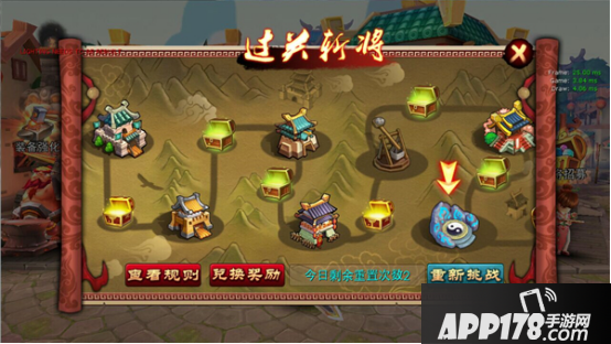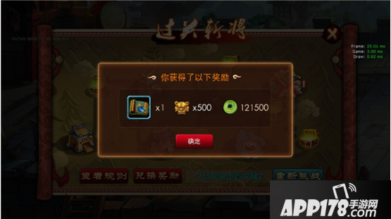 玩家每通过一关都可以开启一个神秘宝箱,宝箱中可以获得各类道具和大量铜钱,还有过关斩将对应的积分。