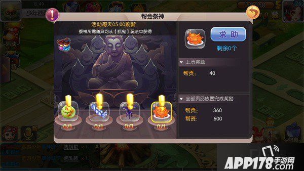 当自己的祭神道具不足时也不用担心哦,可以向同帮会的玩家求助,同样的如果自己的道具有多的时候也可以帮助其他玩家上贡,单个贡品的收益会给到帮助者。