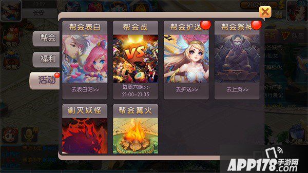 帮会日常活动可以从帮会活动的页签进入,完成日常活动后,帮会成员可以获得帮贡、铜钱等奖励,帮会则可以获得资金。