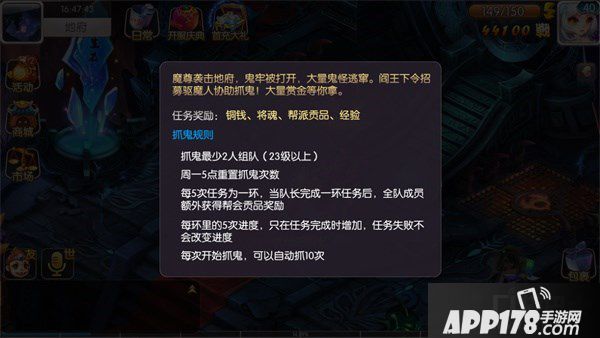 抓鬼玩法24小时开启,需要玩家等级达到23级,2人以上玩家组队参加任务。