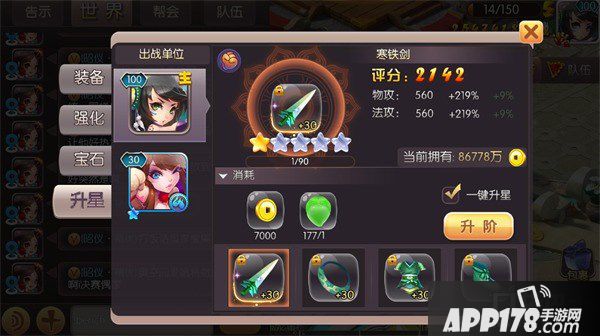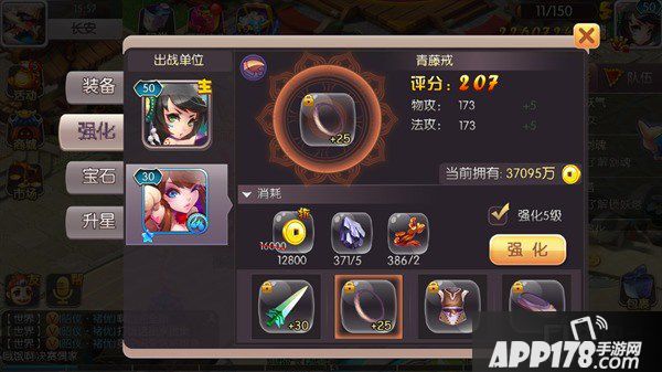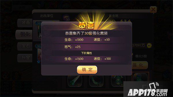 每个上阵的单位(主角和神将)都可以穿上装备,装备分为武器、铠甲、鞋子和饰品,不同部位的装备加成的属性也不同。装备有主要有强化、升星和宝石镶嵌。