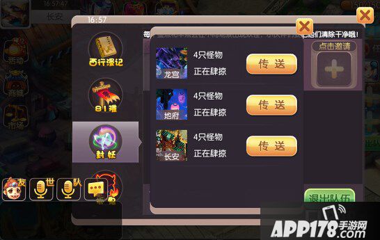 组队之后,队长可以在龙宫、长安城、地府寻找魔族踪迹,点击怪物进行挑战。挑战成功即可获得丰厚的奖励。