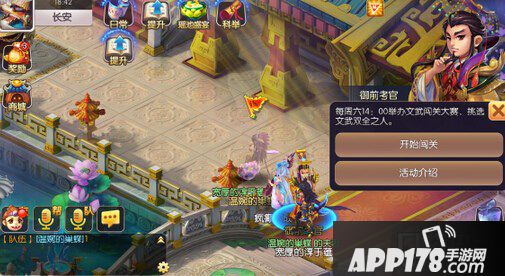 每周六14:00-18:00开启文武闯关,需三人组队成行,到长安找御前考官,即可开启闯关之旅!在闯关副本中,需要连续通过10位文考官和10位武考官考验方可顺利通关。重重挑战即将一波接一波来袭,考验各位英雄的智慧和队伍配合时刻即将到来!
