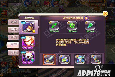 每件装备上都有三个可以镶嵌宝石的孔,每件装备都可以镶嵌三颗宝石,镶嵌宝石可以增加神将的多种属性,从而大幅度提升角色的战斗力。镶嵌的宝石可以从神秘商店中购买!