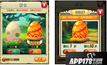 孵化“高级蛋”可随机获得2~5星品质战宠,每24小时可免费孵化一枚。孵化“传说蛋”可随机获得3~5星品质战宠,每48小时可免费孵化一枚。玩家可消耗钻石进行加速孵化,剩余孵化时间越短,所需消耗的钻石越少。单次“高级蛋”加速孵化最高需要95钻石,单次“传说蛋”加速孵化最高需要287钻石。另外,现在渔村孵化处实施福利政策,10连加速孵化“传说蛋”只需2591钻石。