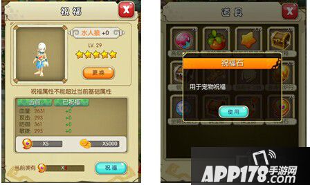 玩家在“祝福”界面通过对宠物进行祝福,可随机增加一定量的宠物属性。进行祝福需要消耗一定数量的石币和道具“祝福石”,祝福石可由通过在副本活动、声望商城、黑市、宝箱等途径进行获取。