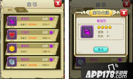 不同宝石具有不同属性,玩家可通过宝石强化功能,使用其他宝石提升主宝石等级,从而增加主宝石相应属性。玩家可将宝石镶嵌至装备,从而提升装备属性。