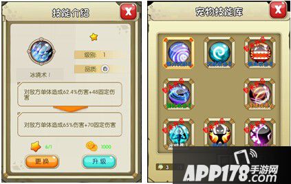 当玩家角色提升至9级时,且对应角色、宠物进阶达到1阶及以上时,就可以使用“技能更换”功能了。玩家在阵容界面点击相应角色、宠物想要替换的技能图标,在弹出的技能介绍弹窗中,点击“更换”进入宠物技能库,而后点击“转动”键消耗钻石或“技能学习器”即可由技能库已解锁技能中随机获得新技能了。角色、宠物进阶等级越高,对应角色、宠物的技能库解锁技能数量越多。