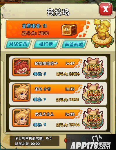 在竞技场界面中,各位勇士可以对其他相近排名玩家进行挑战,当然挑战是有一定策略的,各位勇士要先行查看备选挑战对手的战斗力是否过于强大,如果比自己团队战斗力高过太多,就先饶他一命,等日后实力强大了再来弄死他。竞技场每日可挑战5次,每次挑战冷却时间为10分钟,如果觉得打的次数太少不过瘾的话,还可以消耗龙蛋购买挑战次数。