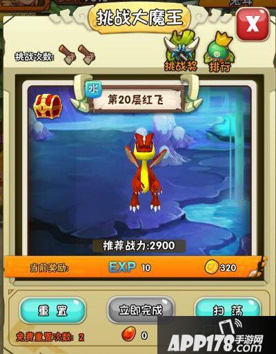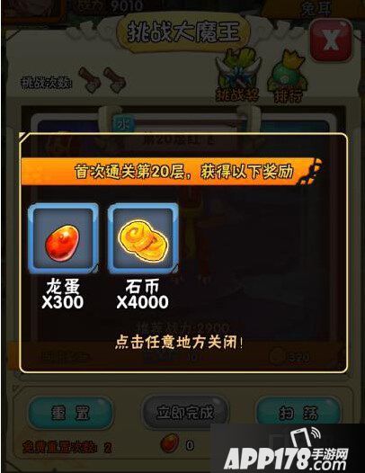 玩家在活动中需要从魔王塔第1层开始逐层挑战,每一层为魔王守塔的怪物实力都是递增的。玩家每天有2次机会挑战,和免费重置次数2次。每打败一层关卡都会获得经验和金钱石币奖励,每成功挑战5层会获得大量奖励。失败2次后将无奈退出当日挑战。