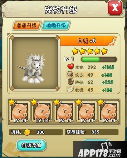目前游戏中支持的宠物升级方法共有两种:普通升级、魂魄升级。普通升级是使用陪练材料宠物对主升级宠物进行等级提升的方法,需要消耗金钱石币、陪练宠物进行升级。陪练宠物的等级越高,可获取的经验也就越多。玩家可手动添加想要作为升级材料的宠物,也可使用自动添加功能,系统会自动选择低品质宠物进行添加。在确认无误后,点击“升级”键,即可完成主宠物升级操作了。