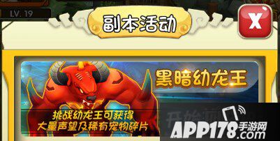 挑战黑暗幼龙王是每日定时世界boss活动,每晚21:00整石器大陆第一邪恶boss黑暗幼龙王便会现身,在21:30的时候他的保护光罩就会消失,此时正是各位勇士干掉他的好机会。而且,参加挑战黑暗幼龙王活动可以获得大量金钱石币、声望和稀有宠物碎片。当活动开启时,玩家可通过主界面中“副本”键进入“副本活动”列表,从列表中就可以选择进入黑暗幼龙王挑战空间参加活动了。如果未在挑战开启时间,也可查看到下一次开启的倒计时。
