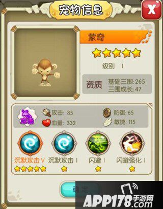 蒙奇是一只沉默的猴子,虽然话不多但样貌可爱!超强技能沉默攻击在战斗中会有出其不意攻其不备的效果!拥有矫捷身躯的蒙奇是战斗必备宠物哦~