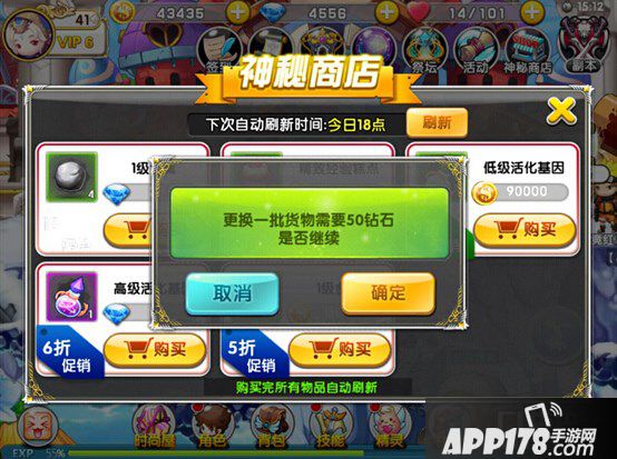 对于小资和土豪来说那就用金钱换时间,把“神秘商店”里的6件道具全部购买完毕,系统会自动更新,或者直接用刷新功能,前5次都是花费50钻石更换全部货物,后面刷新的次数越多,钻石消耗的数量就越大了,根据次数花费80钻石、150钻石、200钻石封顶。