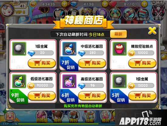 “神秘商店”里每次只摆放6种道具出售,没有自己想买的怎么办?没关系,系统会在每天的中午12点和晚上18点自动更新商城。对于非人民币玩家来说,花点儿在游戏里挣的小钱儿在“神秘商店”消费一下买些急需的道具救急,还是没有问题的。