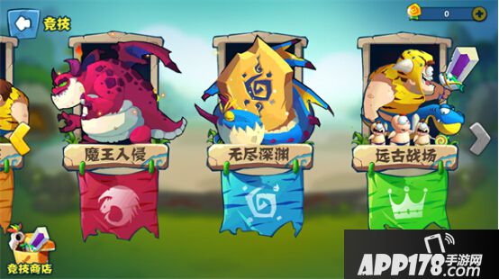 从大厅的【竞技】图标进入到竞技界面,能看到一个原始人骑着恐龙拿着石剑带着一群小弟冲锋,没错,这就是咱们要去挑战的远古战场了