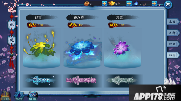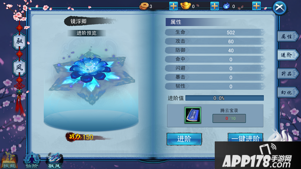打开“驭风”界面,点击“进阶”功能, 系统会判定进阶所需物品是否满足个数,若满足则扣除对应的进阶物品个数,并提升相应的经验值,每次培养都会增加一定的百分比,当某次进阶的操作使经验条到达百分之百时驭风进阶成功。