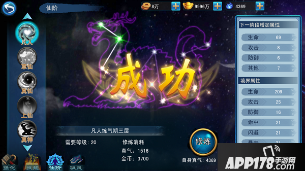 仙阶总共分为6大阶段,凡人、草仙、真仙、上仙、真神、上神。修炼仙阶需要消耗真气及金币,每次修炼都会获得一定的属性加成,当某个仙阶等级升满时,需要使用突破道具进行突破后方可进入下一仙阶的修炼。