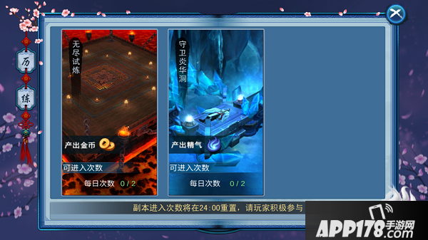 历练副本目前开放2个,在玩家达到等级后开启。每章副本每日都可进入两次,完成副本后可以领取该副本奖励,每个副本分别设有简单、普通、困难3种模式,角色达到对应等级后会自动解锁。