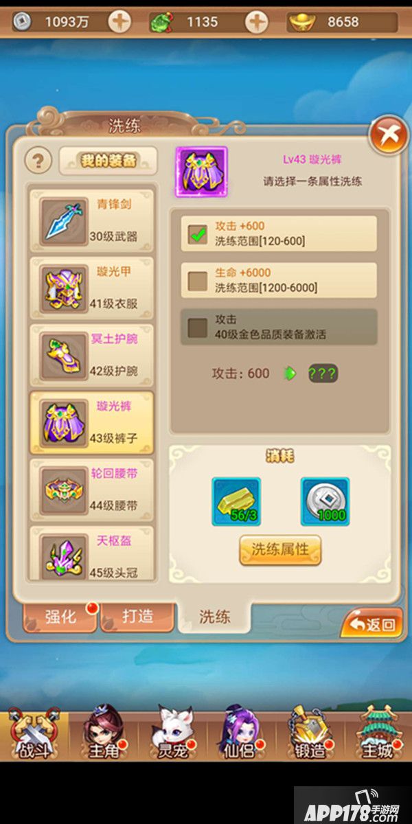 洗练:当玩家打造出40级紫色以上品质的装备时,该装备即可触发洗练功能,玩家可以通过消耗洗练石和银两的方式为装备洗练属性,洗练时装备的附加属性有一定概率提升。值得注意的是洗练属性为附加属性,玩家如果更换装备后附加属性无法继承至新装备。
