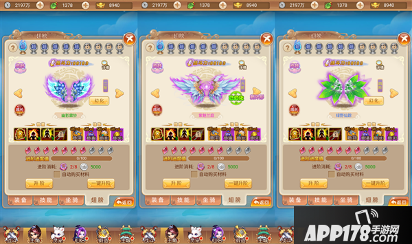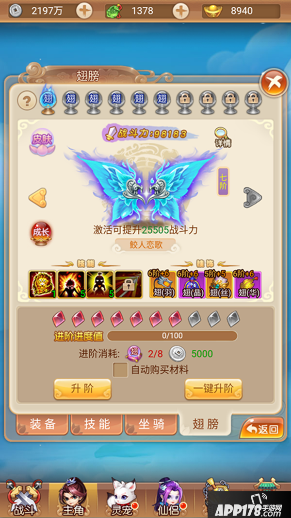 通常玩家首先接触到的就是翅膀升阶,消耗翅膀进阶丹和少量银币可对翅膀进行进阶培养,且有一键升阶功能,点击后便会自动升阶,避免了玩家反复点击,十分便捷,可看出功能设计上还是十分人性化的。