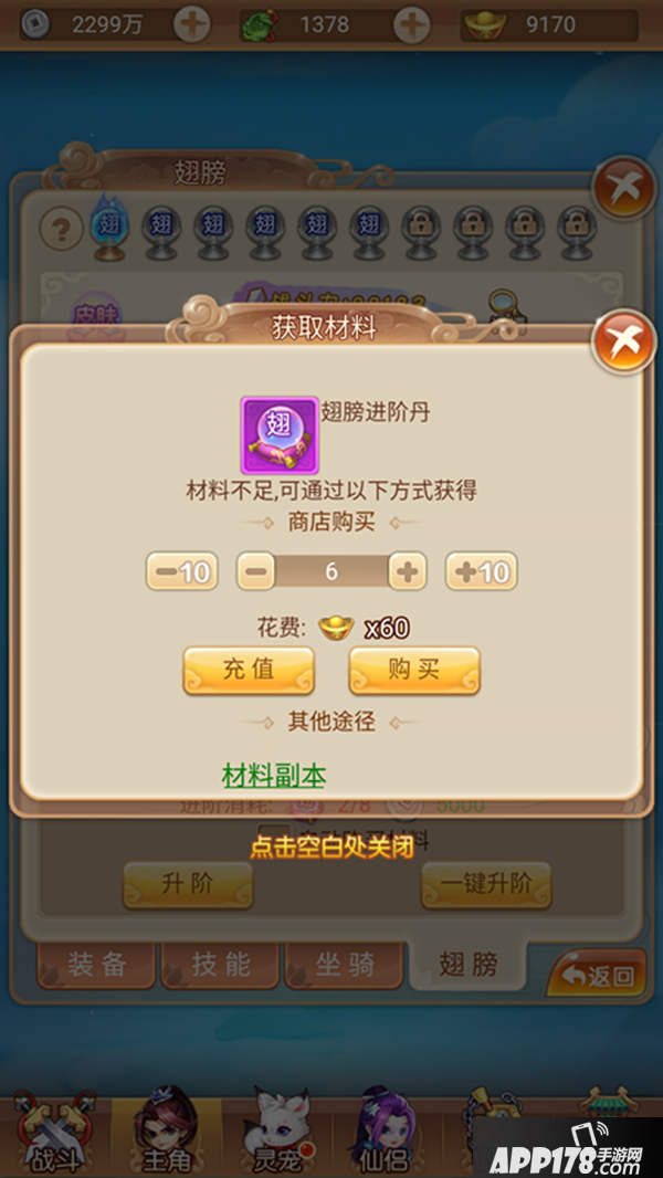 翅膀进阶丹在游戏中有多种途径可以获得,如材料副本、竞技福利商店、灵玉商城、元宝商城、酿酒升级奖励、组队副本等。所以每天的材料副本和组队副本一定要做完,竞技场尽量的争取排名,当距离升阶稍微差一点的时候也可以使用元宝兑换,以应所需。