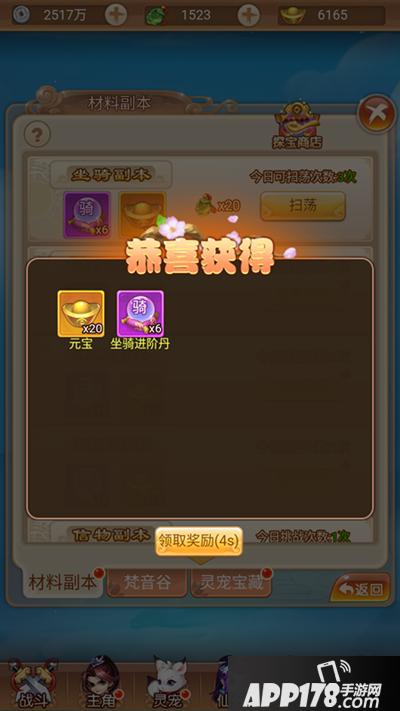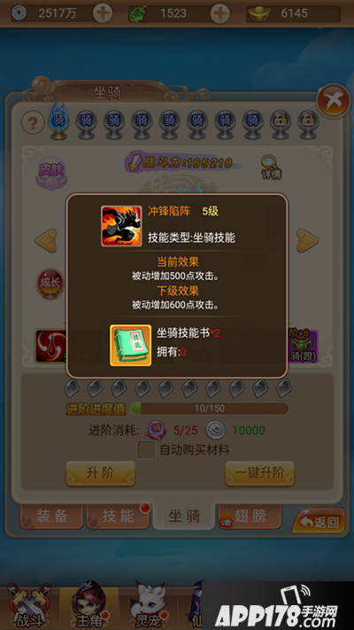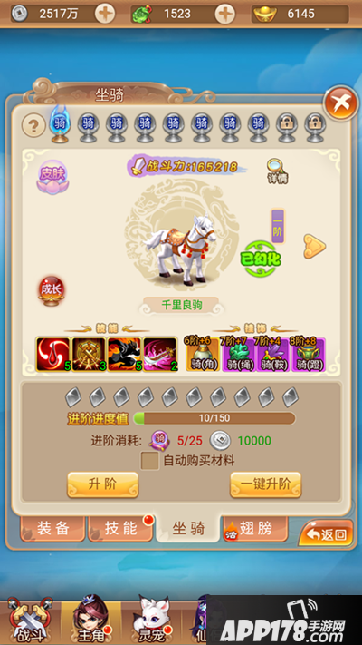 那么问题来了,具体如何对坐骑进行升阶呢?方式很简单,只需点击界面中的升阶或一键升阶即可,消耗坐骑进阶丹和少量的银币,而坐骑进阶丹在游戏中可以通过材料副本、竞技福利、灵宝商店、组队副本等途径获得,产出方式十分多样。