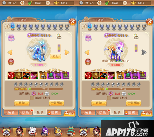 看造型感觉是不是很朴素?不过不用着急,坐骑的造型会随着的升阶不断的变化,每升一阶变一次,越来越酷炫,并且也有多种不同的风格。比如小编本人最喜欢的就是6阶的苍穹麟马和9阶的紫炎麟兽,大家可以见图感受一下。