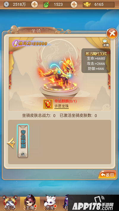 此外,坐骑还可以更换皮肤,如果对升阶自动解锁的造型不满意的话,可以去获取自己心仪的坐骑皮肤,除了让造型变得更加酷炫之外,还可以增加战斗力。如图中的帝焰麒麟,便是本小编特别心水的坐骑皮肤,全身火焰包括、龙头马身,十分拉风。