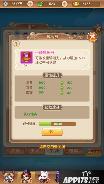 消耗坐骑成长丹进行成长,坐骑成长丹可通过引导任务奖励等途径获得。