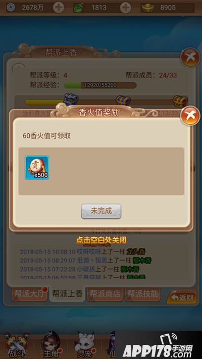 帮派成员每日可进行帮派上香,上香次数与帮派当前等级可拥有帮派成员上限相同,且每日上香达到一定的香火值可开启宝箱奖励,第一和第三个宝箱有帮贡奖励。