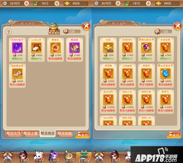 帮派商店中具有灵宠升星丹、心法口诀、精金石、藏宝图等材料;帮派福利中具有称号、法宝皮肤、时装、神兵皮肤等,更重要的是帮派福利中还具有SSR宠物激活卡:葵水灵、独角仙。没错,不需要花钱,只需要使用帮贡即可兑换购买。